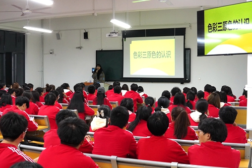 在本次讲座中,王老师从“三原色的认识”和“色彩的构成”两个方面带领同学们进入色彩艺术的殿堂。首先,王老师从色彩三原色入手,展示色彩的叠加,生动形象地解释了色彩艺术的运用,激发了同学们对色彩艺术的兴趣。接着为进一步让同学们体会色彩的魅力,王老师又介绍了视觉混合概念,提出“太阳照射后的视角变化”,来引发同学们的共鸣。引用印象派的彩油画画风和PS软件的工作原理,来解释三原色的混合,然后,王老师通过视频介绍色彩反射入对人脑的颜色感知,通过对波长吸收和反射的分析,来解释视觉混合的原理,运用色相环来拓展类似色、中差色、对比色等概念,拓宽了同学们的艺术视野。最后王老师向同学们介绍了用色彩间深浅层次的对比引出明度的概念,引用生活中装修风格学以致用,对比教室与电影院墙体颜色的不同,来解释色彩艺术在生活中的重要性。