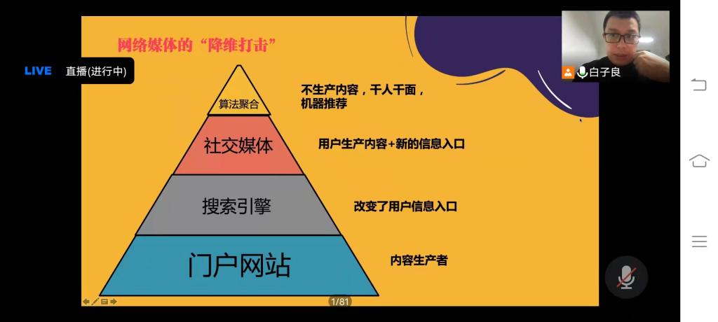 讲座中,白老师从传统媒体与新媒体、信息流的传播方式、亚文化的正负能量、青年人的文化焦虑四个方面展开论述。首先,白老师介绍了传统媒体与新媒体关系,通过新闻五要素、新媒体互联网、信息茧房等内容的介绍,让同学们更深入地了解了传统媒体和新媒体的区别。接着,白老师通过展示中国互联网的发展历史、网络媒体的“降维打击”、传播渠道的三个变化趋势、网络舆论中的“子贡陷阱”,讲解了信息流的传播方式。随后,通过举例泰迪男孩、嬉皮士、御宅族、非主流、EDG的故事,对亚文化的正负能量进行合理辨析,引导同学们思考“当亚文化现象已经无处不在,我们应该如何面对?”最后,白老师介绍了西方和中国的人文主义传统的相似与不同,以及如何摆脱信息大爆炸中的青年文化焦虑,重新思考“人”的问题。