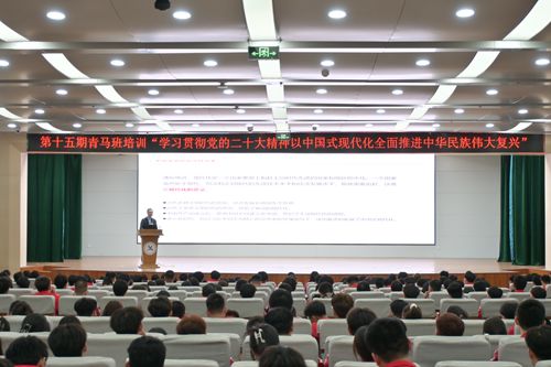 奋进新征程,扬帆再出发。为进一步提升青年团学干部思想引领,培养堪当民族复兴重任的时代新人。5月8日晚,马克思主义学院董超老师为第十五期青马班全体参训学员带来一场题为“学习贯彻党的二十大精神 以中国式现代化全面推进中华民族伟大复兴”的专题讲座。