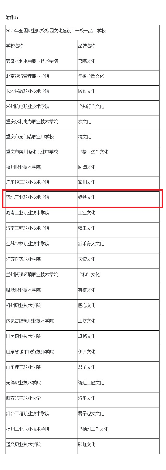 近日,教育部职业院校文化素质教育指导委员会公布了2020年全国职业院校三亿(中国)建设“一校一品”申报结果。经专家评议、专家复评、专委会会评、教指委审定,在177所职业院校178项成果申报中,确定26所职业院校为全国职业院校三亿(中国)“一校一品”学校,我院“钢铁文化”三亿(中国)建设品牌成功入选。