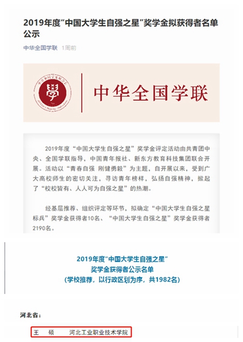 近日,由共青团中央、全国学联等部门联合开展的“中国大学生自强之星”奖学金评选结果揭晓。我校智能制造系王硕同学经过层层推荐,荣获2019年度“中国大学生自强之星”。