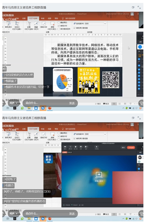 赵老师从“新媒体与传统媒体的异同”、“当共青团遇到新媒体怎么办”和“互联网思维”三大方面为同学们进行了精彩的分享,并以一线“操盘手”的实战经验,运用大量数据、实例进行细致的讲解,分析了共青团新媒体的定位、作用、传播特征以及如何运营,使在线的师生真切感受和学习到共青团新媒体的运行“套路”。