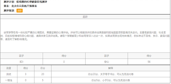 根据测评结果警戒、高危、追踪、关注、正常五级划分,从学业压力、家庭情况、社会支持、情绪状态、饮食睡眠等方面对4996名学生做了进一步了解,线上访谈学生71人,危机干预6人。及时了解学生心理状况和心理需求,有针对性开展心理辅导。