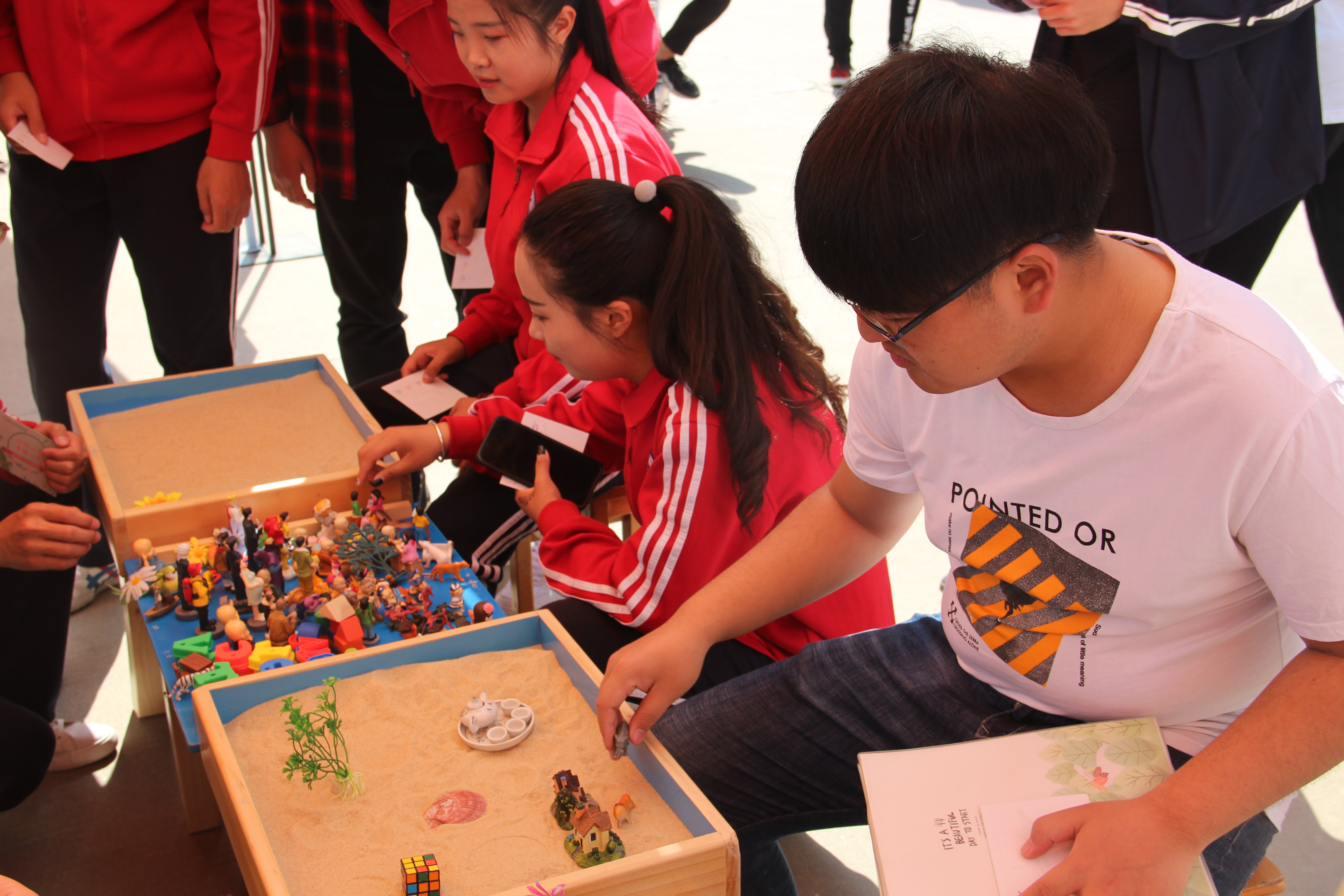 学工部负责人首先宣布心理健康节开幕,在场老师共同拼起代表着梦想和希望的“阳光笑脸”。老师们在展板上为同学们书写心灵寄语,“你不能改变天气,但可以改变心情”“做最好的自己”“健康的心理为你插上飞翔的翅膀”,表达了对同学们心理健康的关怀与心灵成长的期待。接下来的心理趣味游园会采用打卡的方式,每完成一项游戏,可获得1枚印章。打卡5项活动,获得5枚印章,即可获得抽取小礼品的机会。本次活动共设置八个活动区域。在“微笑的力量”笑脸墙前,同学们手持道具微笑合影。在“爱我你就夸夸我”活动中,几位遇到不同事情的同学手持道具“求夸”的场景,吸引了不少同学的参与,真诚而走心的夸奖令人感动。“曼陀罗绘画减压”摊位前人头攒动,同学们在曼陀罗图案上自由绘画,发现个体潜能,疏导不良情绪,激活内在能量。“倾听内心的声音”,通过珍爱卡体验,藉由分享、叙说,使同学们了解自己的意识、潜意识,并能给予有启发性的建议。“探索心灵花园”通过沙盘体验,用积极的想象创造场景,用非言语的方式为同学们搭建一个安全、包容的表达空间。“心心相印”背夹球、不倒森林、珠行万里等游戏,通过团队合作的形式,加强同学们之间的沟通和交流,培养团队精神和集体合作意识。活动现场气氛热烈,同学们纷纷表示,通过此次活动对自身有了更全面地认识和了解,对于更好地悦纳自己有了进一步的体会和感受。