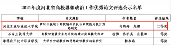 近日,由河北省学校德育工作中心、高校思想政治工作队伍培训研修中心组织的2021年度河北省高校思想政治工作优秀论文评选结果公示,我校互联网学院张思雨老师、梁海建老师撰写的论文《高校辅导员队伍应对突发事件能力的提升研究》和工商管理系何晓卉老师、赵娜老师撰写的论文《新时代视域下高校辅导员队伍素质能力提升策略研究》均获二等奖。