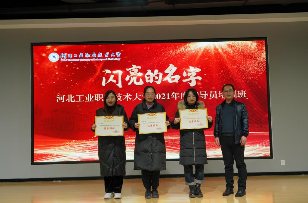 培训分觉知——辅导员职业能力提升、疏解——漫谈心理学在学生工作中的应用、凝聚——怎样提高班级向心力、卓越——“学霸”辅导员的精彩未来“四大模块”进行,邀请了石家庄学院姚振伟、河北中医学院边文静和姜萌、我校马克思主义学院刘佳四位老师组成的河北省辅导员精英团队进行讲授。此外,还精心设计了团队破冰、心理解压、主题班会设计、辅导员年度人物孵化、精品项目打磨等实操研讨环节,通过专题教学、互动教学、体验教学等形式进一步增强职业理论素养,深化工作服务内涵。培训打破系(院)界限将参训老师划分为15个学习小组,在学习过程中,全体参训辅导员积极参与,在交流中加深沟通,在团队展示中凝聚超越。通过评委的打分点评和培训小结进一步拓展了工作思路。培训还注重以仪式教育,引导辅导员树立岗位情怀,增强育人责任感与使命感。校史馆、党建教育基地的参观学习,带领全体参训辅导员,学习党的百年光辉,感受学校历史底蕴。最终由互联网学院张思雨老师带领的第一组、由计算机技术系褚硕老师带领的第二组、由智能制造学院沈丽月老师带领的第四组荣获优秀团队。