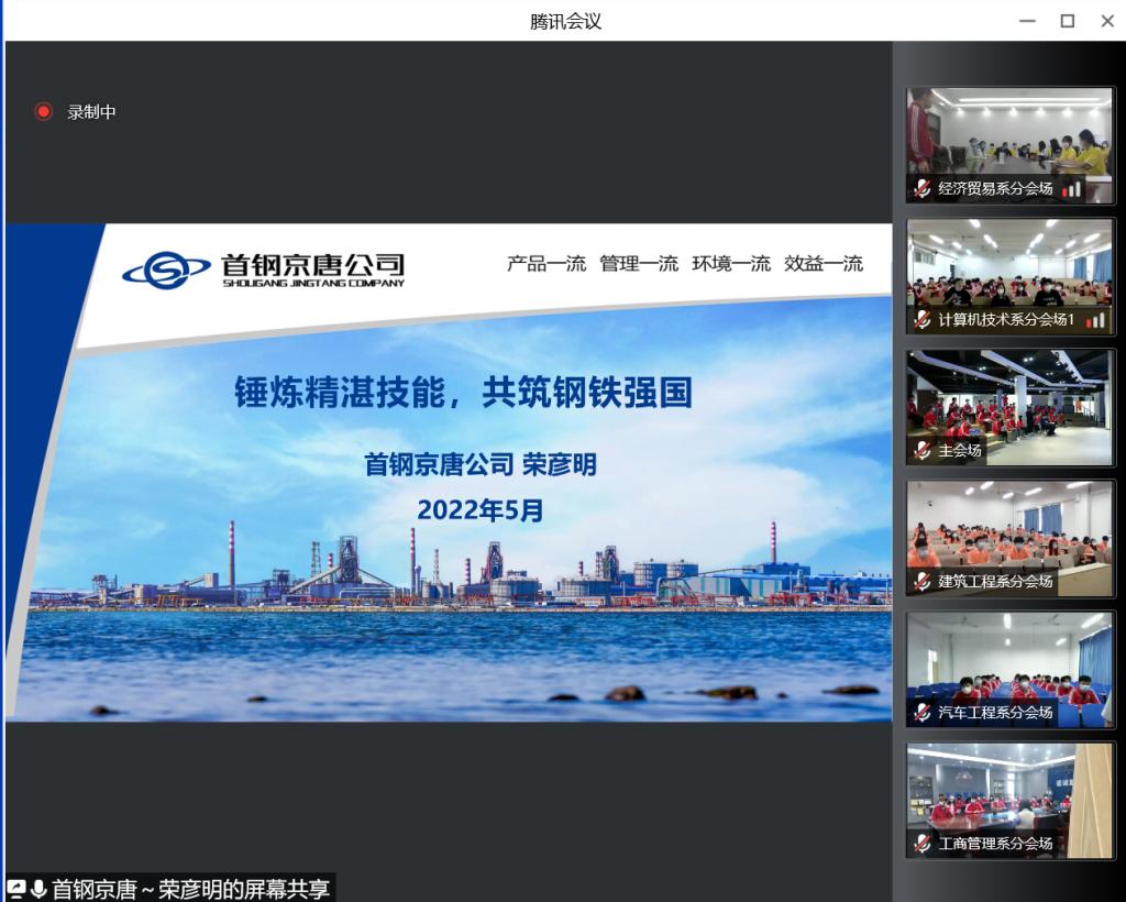 通过线上平台,荣彦明以“锤炼精湛技能 共筑钢铁强国”为主题首先进行讲述,从初入职场、苦练技能、执着创新、志愿防疫、悉心帮徒、牢守使命等方面,用专业学习的经验、参加大赛的经历、职场打拼的所悟现身说法,为学弟学妹们传授职场经验、讲解技能提升、诠释劳动精神。并希望大家要树立远大理想,在校期间要努力提升专业知识水平和各方面能力,提前规划生涯目标,保持良好心态,“小我”融入“大我”,为祖国发展贡献力量。讲述完后同学们结合自身主动思考、积极提问,荣彦明学长针对同学们的提问逐一做了详细解答。
