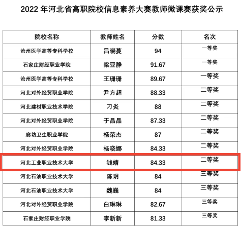 11月14日,由河北省高校图工委、河北省高职高专院校图书馆工作研究会主办、河北对外经贸职业学院承办的“2022年河北省高职院校信息素养大赛”落下帷幕。我校师生在本次比赛中荣获二等奖2项,三等奖1项。